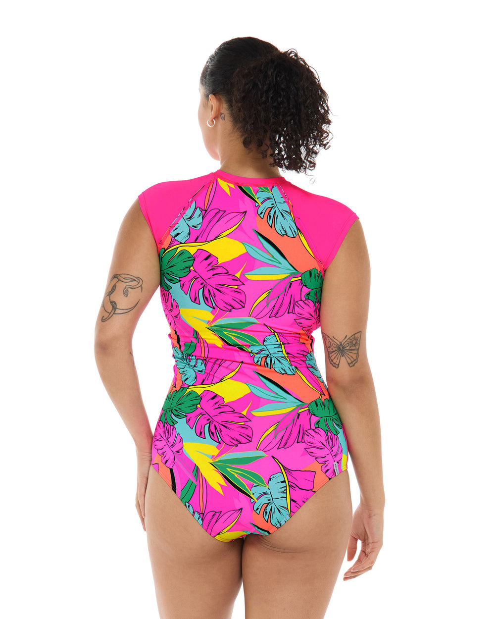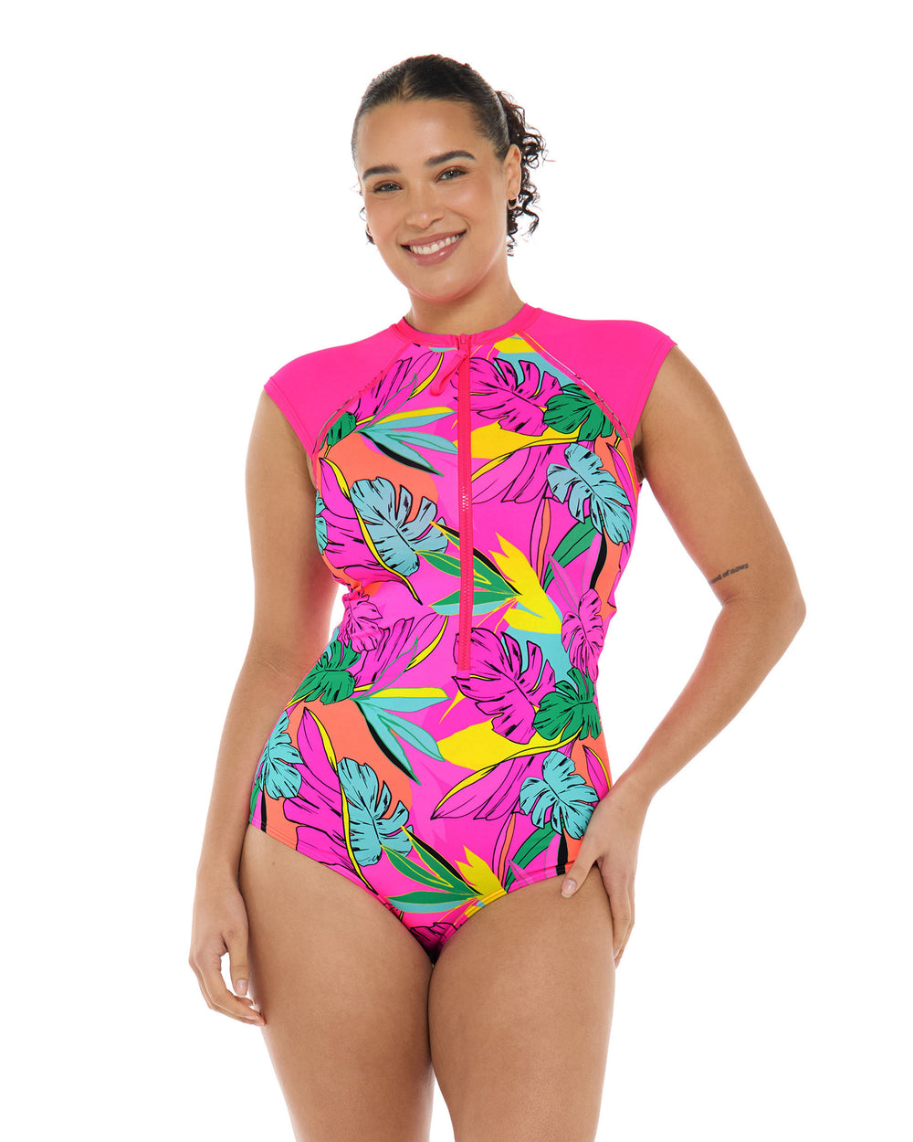 You’ll be standing nice and tall in the Stand Up one-piece swimsuit. This crew neck piece features raglan cap sleeves and a zip front, as well as UPF 50 fabric that shield you from the sun’s rays. Stand Up’s flatlock seams and mid-coverage bottom will have you feeling comfy and confident all day long!