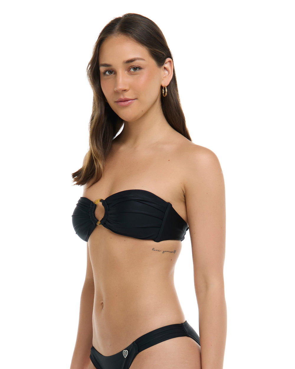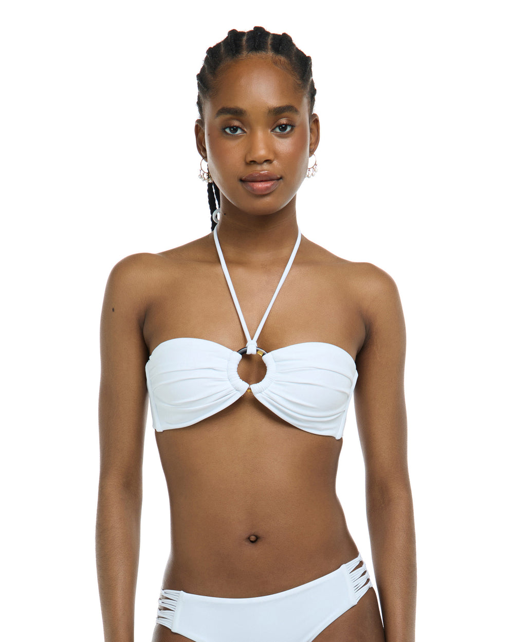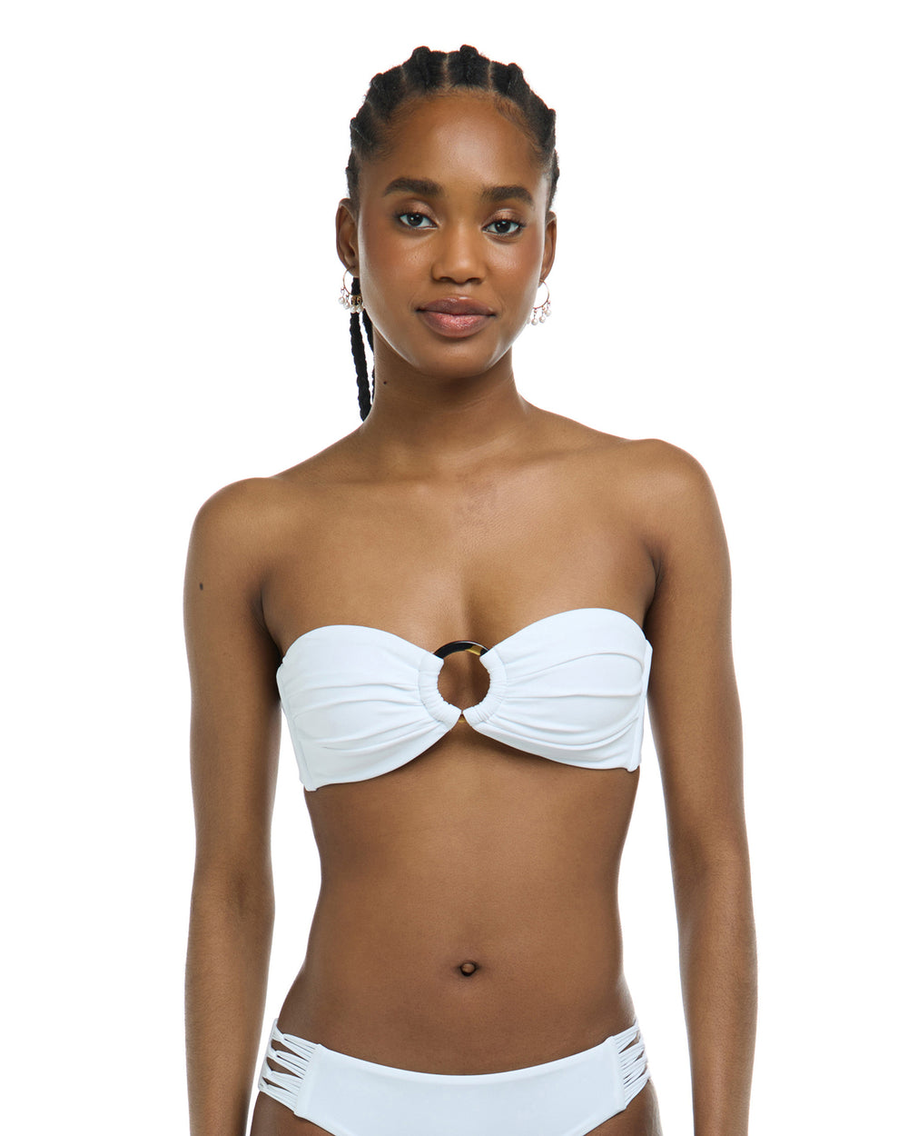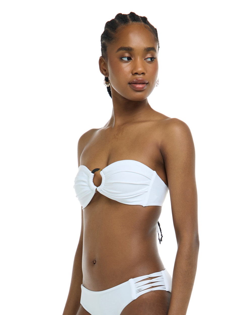 Irene is your ultimate beachside companion exuding effortless charm! This bandeau top boasts captivating front ring and pleat details, adding a touch of sophistication to your swimwear collection. With its sash tie back, Irene ensures a secure yet stylish fit for all your sunny adventures.